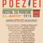 Sâmbătă, 21 martie 2015, la Librăria Open Art (aflată la intersecţia străzilor Pitar Moş şi Arthur Verona) din Bucureşti, între orele 11.30- 14.00, a avut loc a doua ediţie a evenimentului RECITAL CU PERECHE – “Noi şi amintirea lor”, un proiect ce a marcat sărbătorirea Zilei Internaţionale a Poeziei.  11  poeţi contemporani (Ioana Diaconescu, Simona-Grazia Dima, Mariana Filimon, Ioana Greceanu, Dan Iancu, Riri Sylvia Manor, Anca Mizumschi, Niculina Oprea, Liviu Ioan Stoiciu, Grigore Şoitu, Lucian Vasilescu) au citit poemele a 11 poeţi români plecaţi în raiul poeziei. A fost evocat, într-un moment special, marele actor și recitator Eusebiu Ștefănescu, recent dispărut dintre noi. Amfitrioni: Dan Mircea Cipariu şi Ioan Cristescu.  Art director: Mihai Zgondoiu. Producător: Anamaria Spătaru. Organizator: Filiala Bucureşti Poezie a Uniunii Scriitorilor din România. Coproducători: Radio România Cultural și Asociaţia Euro CulturArt. Printre cei prezenți la eveniment s-au aflat și Ștefania Coșovei, Margareta Labiș și  scriitorul Cornel George Popa. Pe pereții de la Open Art, locul unde a avut loc evenimentul, pot fi admirate câteva gravuri ale maestrului Mircia Dumitrescu, gravuri inspirate de câteva dintre poemele pe care i le-a dăruit Nichita Stănescu artistului.  Ciclul gravurilor semnate de Mircia Dumitrescu poartă numele ”Nichita Azi”. ,,O zi fastuoasă! Mă bucur că ne aflăm aici, la Librăria Open Art, pe Strada Pictor Verona din București, un spațiu unicat pentru că în el cei care vor putea veni să-l vadă vor găsi cărțile poeților români în viață. În acest spațiu, vom avea o cameră a poeziei. Într-o lume ca a noastră în care veștile sunt rele atunci când vine vorba despre scriitori, este un fapt cu totul și cu totul important acela că putem să oferim colegilor noștri de breaslă un loc de întâlnire în care vom avea lansări de carte, conferințe și tot ce reprezintă viu în literatura română contemporană. Dacă foarte mulți oameni care au câștigat averi în România după 1990 au cheltuit pe te miri ce, eu m-am gândit ca din banii pe care i-am câștigat după 1990 să investesc în acest spațiu cultural, spun spațiu cultural pentru că el nu este  neapărat în înțelesul clasic o librărie . Open Art este un spațiu deschis artiștilor, scriitorilor, mai cu seamă că, după cum bine știți, în ultimii doi ani de zile am avut vești groaznice, am pierdut Casa Monteoru, sediul Uniunii Scriitorilor, am pierdut sediul Muzeului Național al Literaturii Române. Am vrut să fac de Ziua Internațională a Poeziei o frumoasă surpriză colegilor de la Filiala București Poezie. Aceasta este Casa Poeziei. Între 13-17 mai 2015, atunci când organizăm Târgul Internațional al Cărții de Poezie și Maratonul de Poezie și Jazz, vor veni în România 9 directori ai Caselor de Poezie din Europa și sunt foarte bucuros să oferim și noi în această rețea a Caselor de Poezie din Europa acest spațiu. Sunt bucuros că putem colabora ca în ultimii 8 ani de zile cu Radio România Cultural și că putem aduce în fața publicului larg ascultător voci poetice din generații și geografii literare diferite. Ziua Internațională a Poeziei este, se pare, marcată și sărbătorită în România în mai multe orașe. Cred că unele dintre cele mai importante evenimente sunt realizate de către Filiala București Poezie a Uniunii Scriitorilor din România și de către Muzeul Național al Literaturii Române, cu sprijinul APLER (Asociaţia Publicaţiilor Literare şi Editurilor din România) și Opera Scrisă.Ro. Partenerii media ai proiectului sunt Cultura şi AgenţiadeCarte.ro. Coproducători: Radio România Cultural și Asociaţia Euro CulturArt. După acest preambul vă rog să ascultăm prima voce. Eu sunt cu atât mai emoționat cu cât prima pereche a recitalului aduce în prim plan o voce literară care anul trecut a fost alături de noi, este vorba de Cornelia Maria Savu și nu întâmplător deschidem cu perechea Ioana Diaconescu/ Cornelia Maria Savu, pentru că acest titlu –Recital cu pereche– a fost dat în urma unor discuții pe care le-am avut cu Cornelia Maria Savu.”, a declarat Dan Mircea Cipariu, iniţiatorul proiectului RECITAL CU PERECHE.
