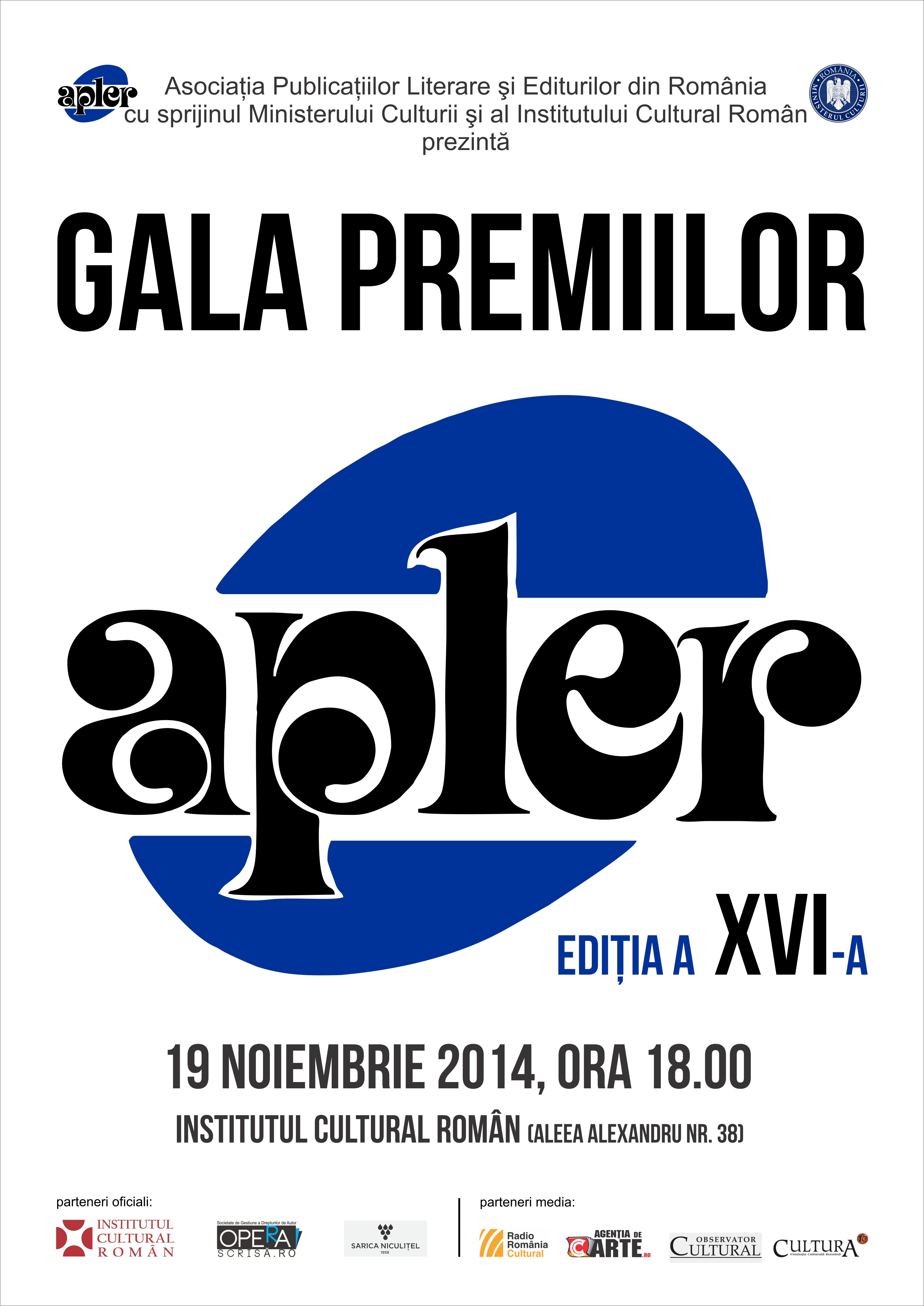 Afis-net-Galele-APLER-2014Miercuri, 19 noiembrie 2014, ora 18.00, la Institutul Cultural Român – ICR (str. Aleea Alexandru, nr.38, sector 1, Bucureşti), va avea loc ediţia a XVI-a a Galei Premiilor APLER (Asociaţia Publicaţiilor Literare şi Editurilor din România). Premiile au vizat cele mai bune titluri ale membrilor APLER publicate în 2013. Evenimentul se bucură de suportul financiar al Ministerului Culturii şi de sprijinul ICR. Partenerii Galei sunt Opera Scrisă.ro – societate de gestiune a drepturilor de autor şi Cramele Sarica Niculiţel. Partenerii media sunt Radio România Cultural, Cultura, Observator Cultural şi AgenţiadeCarte.ro. Juriul Premiilor APLER a fost format din prof.univ.dr. Silviu Angelescu (preşedinte), Ioan Groşan şi Pavel Şuşară. Juriul a acordat premii pentru 13 secţiuni, printre laureaţi regăsinduse academicienii Eugen Simion şi Mircia Dumitrescu, universitarul şi criticul literar Ion Pop, scriitorii Cornel Ivanciuc, Riri Sylvia Manor, Suzan Mehmet, Daniel Bănulescu, Ioan Matiuţ şi Valentin Iacob. Maestrul George Mihăiţă va fi distins cu “Premiul Special pentru promovarea poeziei române contemporane”, iar primarul Sectorului 2 Bucureşti, Neculai Onţanu, şi primarul Municipiului Tulcea, Constantin Hogea, vor primi “Premiul Special pentru promovarea culturii scrise naţionale”. Premiul Editura anului 2013 va fi acordat Editurii Charmides din Bistriţa-Năsăud şi Premiul Revista anului 2013 îi va reveni proiectului on-line AgenţiadeCarte.ro. Premiul pentru Jurnalism cultural îi va fi înmânat jurnalistei Anamaria Spătaru, Radio România Cultural. Amfitrionul Galei Premiilor APLER este universitarul şi criticul de teatru Ioan Cristescu, preşedintele APLER. Conceptul vizual al afişului şi al diplomelor este realizat de artistul vizual Mihai Zgondoiu, câştigător, în trecut, al Premiului APLER Graficianul de Carte. AgenţiadeCarte.ro vă prezintă palamaresul oficial al Premiilor APLER 2014, ediţia a XVI-a. Intrarea la Gală se face numai cu invitaţie. Puteţi solicita invitaţie la eveniment la adresa de email: apler.apler@gmail.com.