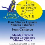 Luni, 3 noiembrie 2014, ora 18.00, în Sala Studio a Teatrului de Comedie din Bucureşti (str. Sf. Dumitru, nr. 2, în Centrul Istoric), Muzeul Naţional al Literaturii Române din Bucureşti (MNLR) prezintă a treia secvenţă a programului Serile de poezie şi blues ale MNLR “POEZIE. LA COMEDIE!”. Vor susţine recitaluri trei dintre cele mai mai importante voci poetice contemporane: Magda Cârneci, Denisa Comănescu şi Miruna Vlada. Amfitrionii Serilor sunt poetul Dan Mircea Cipariu şi muzicianul Mircea Tiberian. Iniţiatorul programului este universitarul şi criticul de teatru Ioan Cristescu, directorul MNLR. La prima ediţie (20 octombrie 2014), au fost invitaţi doi lideri ai poeziei optzeciste, Florin Iaru şi Eugen Suciu. La a doua ediţie (27 octombrie 2014), au citit poeţii Marian Drăghici şi Ioan Es Pop. Organizatori: MNLR şi Teatrul de Comedie (director: Maestrul George Mihăiţă), cu susţinerea financiară a Primăriei Municipiului Bucureşti. Parteneri: Uniunea Scriitorilor din România – Filiala Bucureşti Poezie, Asociaţia Publicaţiilor Literare şi Editurilor din România (APLER), Opera Scrisă.Ro – societate de gestiune a drepturilor de autor. Parteneri media: Radio România Cultural, Observator Cultural, Cultura şi AgenţiadeCarte.ro. În următoarele ediţii vor fi invitaţi Simona-Grazia Dima, Cornelia Maria Savu, Adrian Suciu (10 noiembrie 2014), Laura Dan, Grigore Şoitu şi Teodor Dună (17 noiembrie 2014), Ion Mureşan şi Maestrul George Mihăiţă, cu un recital din poemele scrise de Traian T. Coşovei (24 noiembrie 2014). Afișul programului este realizat de Anna-Maria Orban. Intrarea este liberă!